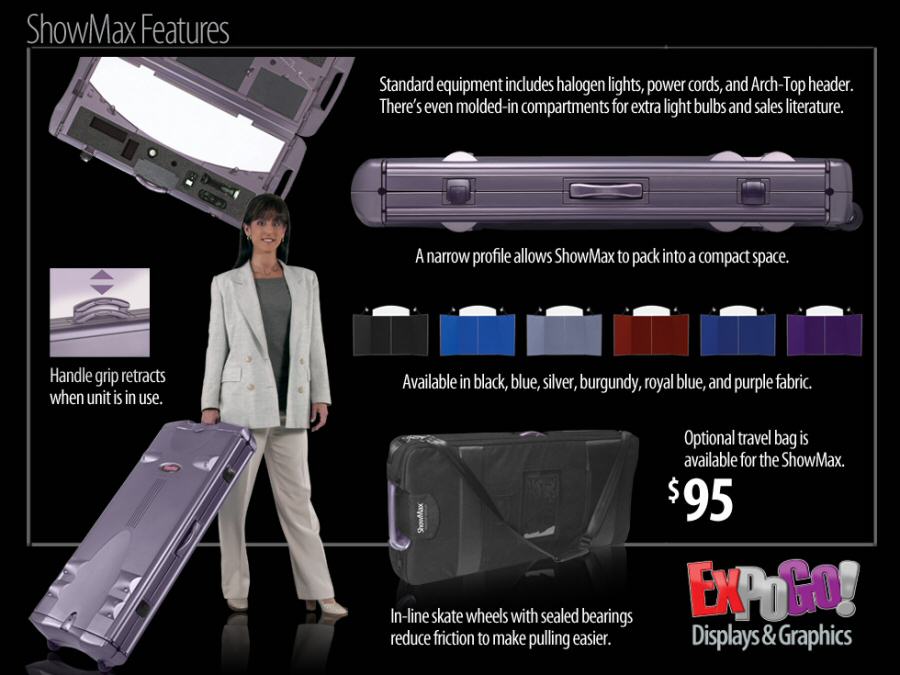 ShowMax Self-Packing Tabletop Displays are available in six colors - Black, Blue, Silver, Burgundy, Royal and Purple.